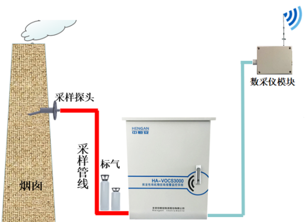 說(shuō)明:由于現(xiàn)場(chǎng)排放尾氣溫度高(100攝氏度以上),并且濕度太大,傳感器直接測(cè)量會(huì)影響使用壽命,故加裝HA-VOCS3000A預(yù)處理系統(tǒng),內(nèi)置抽氣泵將尾氣抽取到監(jiān)測(cè)系統(tǒng)進(jìn)行降溫,除濕等操作后輸送到MIC-600氣室進(jìn)行有害因子檢測(cè),并將檢測(cè)后的信號(hào)通過(guò)無(wú)線模塊上傳當(dāng)?shù)丨h(huán)保部門進(jìn)行集中監(jiān)控。