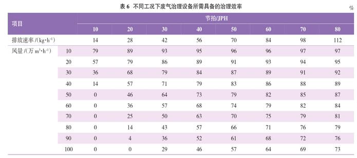 由表6可見,當(dāng)產(chǎn)量較低、排風(fēng)量較大時(表6左下角區(qū)域),幾乎不需要治理排放也能達(dá)標(biāo)(治理效率要求0%);當(dāng)產(chǎn)量較高、排風(fēng)量較小時(表6右上角區(qū)域),治理難度極大(治理效率要求>95%)。