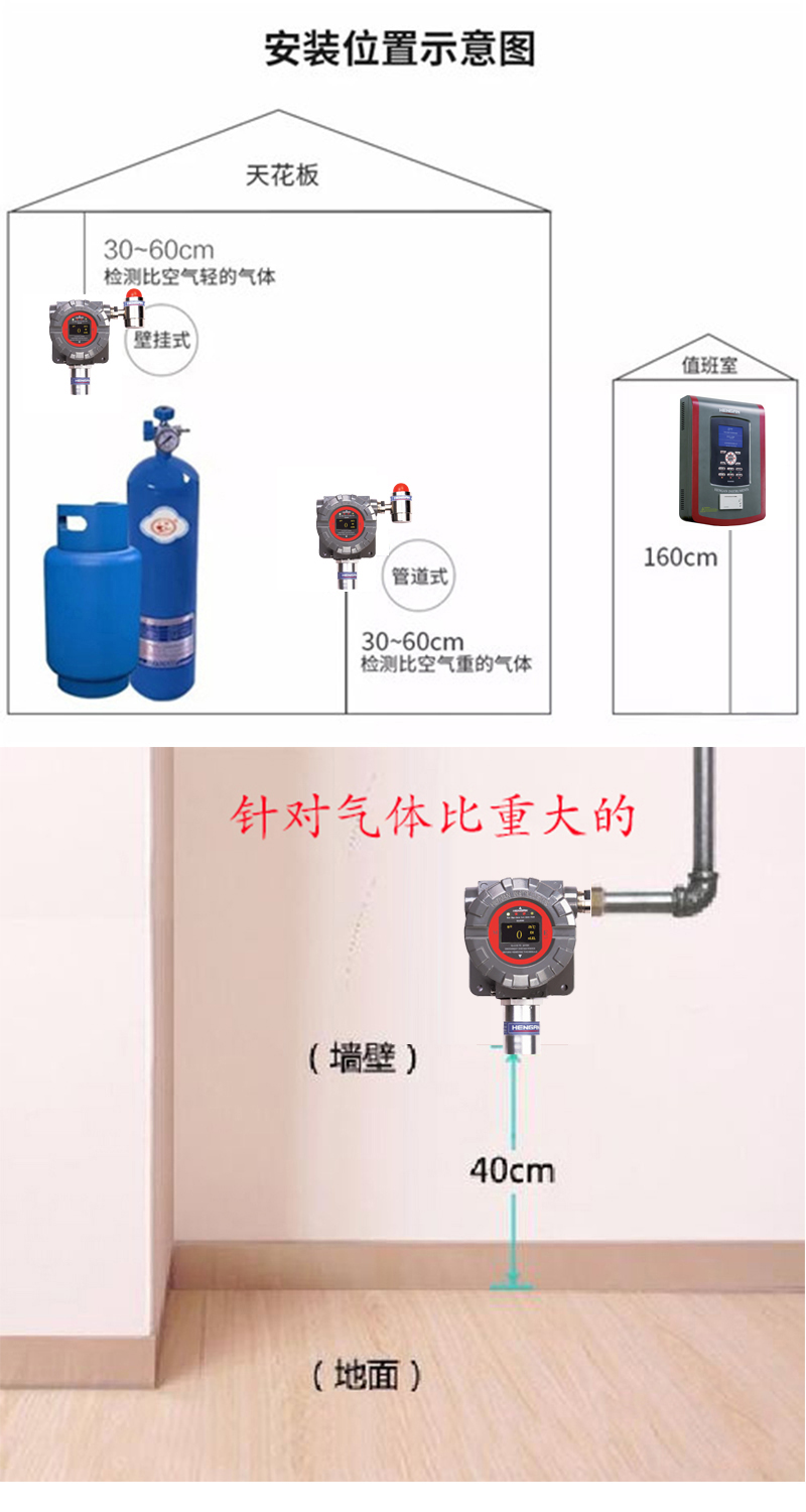 無論是防爆型還是非防爆型探測器,其安裝位置都視檢測對(duì)象氣體而異。即當(dāng)檢測氣體比重比空氣輕時(shí),探測器應(yīng)安裝在接近屋頂,泄露氣體容易滯留處。反之,當(dāng)檢測氣體比重比空氣重時(shí),探測器應(yīng)安裝在接近地面,泄露氣體容易滯留處。