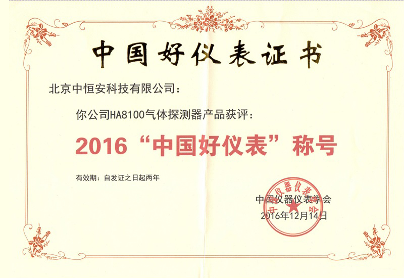 2016”中國(guó)好儀表“HA8100獲獎(jiǎng)證書