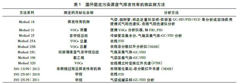美國環(huán)保署推出的VOCs監(jiān)測(cè)方法有環(huán)境空氣VOCs分析方法、室內(nèi)空氣VOCs分析方法和固定源廢氣VOCs分析方法。固定污染源廢氣多采用在線分析儀進(jìn)行現(xiàn)場(chǎng)分析,如在線GC-MS /FID/PID/ECD 等,還可使用傅立葉變換紅外光譜和非分散紅外分析儀,還可將廢氣采集于氣袋或氣瓶中后再進(jìn)行分析。國際標(biāo)準(zhǔn)化組織( ISO) 也發(fā)布了關(guān)于VOCs檢測(cè)的標(biāo)準(zhǔn)方法,對(duì)于固定源廢氣主要采用在線方法,如催化氧化-非分散紅外光譜、GC/FID 等。具體監(jiān)測(cè)方法見表1。