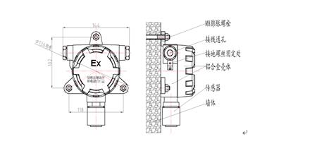安裝方法:在墻上畫(huà)好安裝孔,使用8mm×100mm膨脹螺栓,在墻面固定好的膨脹螺栓,將變送器安上,再用螺母加彈墊和平墊固定好,見(jiàn)圖5。安裝高度根據(jù)測(cè)試的氣體不同而不同,原則上比空氣輕的氣體安裝在泄露源上方,反之 安裝在泄露源下方,具體判斷方法,查看氣體分子量,如果比28小,則比空氣輕,如果比28大,則比空氣重,變送器固定好后將上蓋卸下,從進(jìn)線口引入兩芯電纜(Ex型為三線制)。按正負(fù)極性接入接線端子(Ex型圖示連接)見(jiàn)結(jié)構(gòu)圖,然后鎖緊防水接頭,各環(huán)節(jié)檢查無(wú)誤后,將上蓋擰緊。