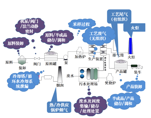 石油煉制工業(yè)大氣污染物排放解決方案 排放特征 煉油與石油化工行業(yè)VOCs主要來自工藝有組織排放、火炬氣、工藝無組織排放、有機(jī)液體存儲(chǔ)與調(diào)和揮發(fā)、廢水收集及處理過程、設(shè)備動(dòng)靜密封點(diǎn)泄漏、有機(jī)液體裝卸揮發(fā)、冷卻塔和循環(huán)冷卻水系統(tǒng)等十二個(gè)有組織和無組織排放源項(xiàng)。其中,VOCs工藝有組織排放占比相對(duì)較小。 ..2021-08-23